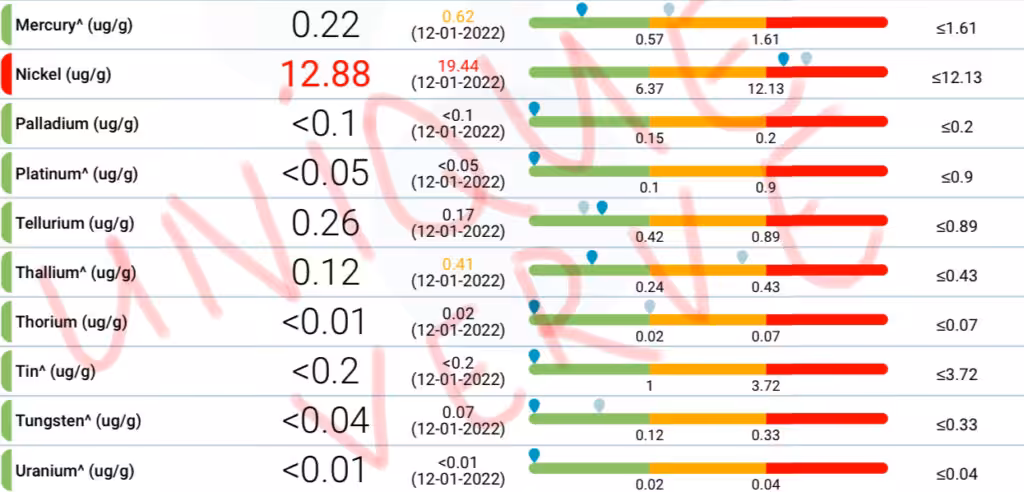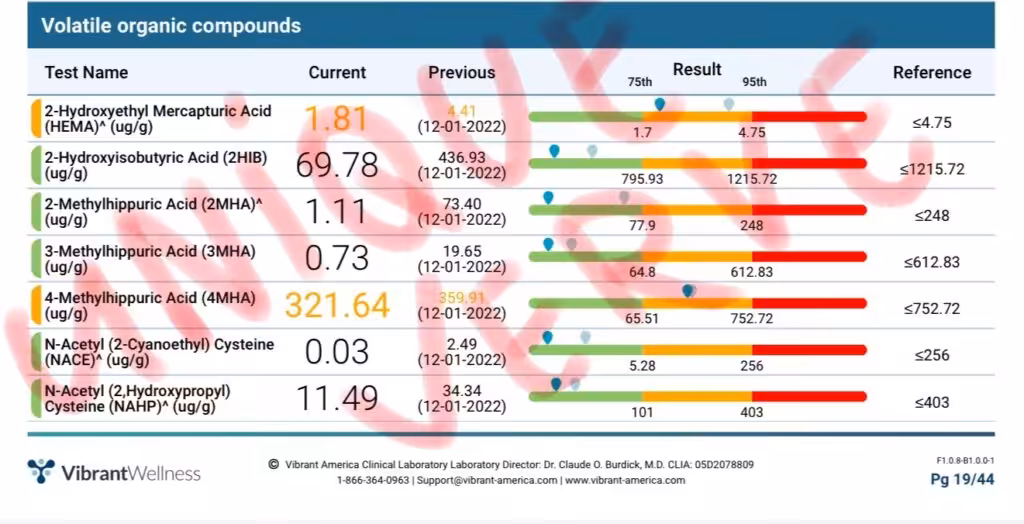 The proof is in the results! Below are the Vibrant Total Tox Burden test results, demonstrating the effectiveness of our science-backed detoxification treatment through a significant reduction in environmental toxins, VOCs, BPAs parabens, glyphosate, mycotoxins, heavy metals.