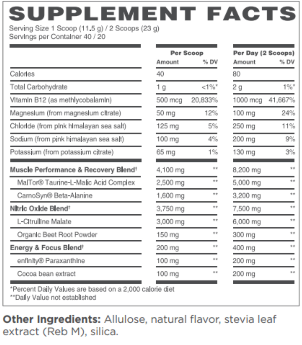 Citrulline L-Citrulline Malate,  MalTor® (Taurine-L-Malic Acid),  CarnoSyn® Alanine Beta-Alanine (98.00% Alanine), Organic Beet Root Powder (Beta Vulgaris), Enfinity® (Paraxanthine), Cocoa (Theobroma Cacao, 10.00% Theobromine), Pink Himalayan Salt, Potassium & Magnesium Citrate, & Methycobalamin.
